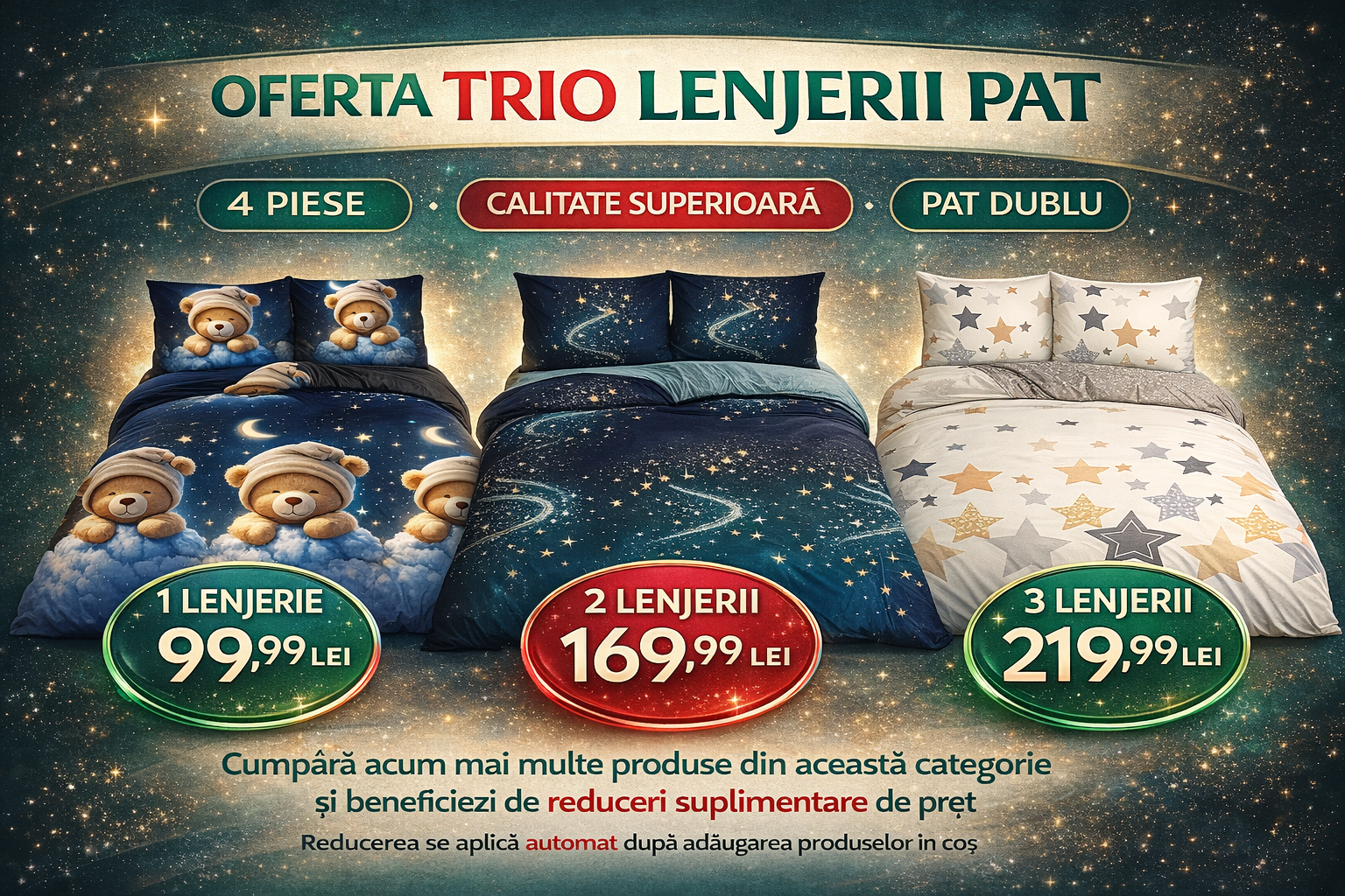 Fie că vrei să-ți înfrumusețezi dormitorul cu lenjerii din bumbac finet, să protejezi mobilierul cu huse moderne sau să adaugi un strop de confort cu prosoape pufoase, aici găsești produse practice, frumoase și accesibile.