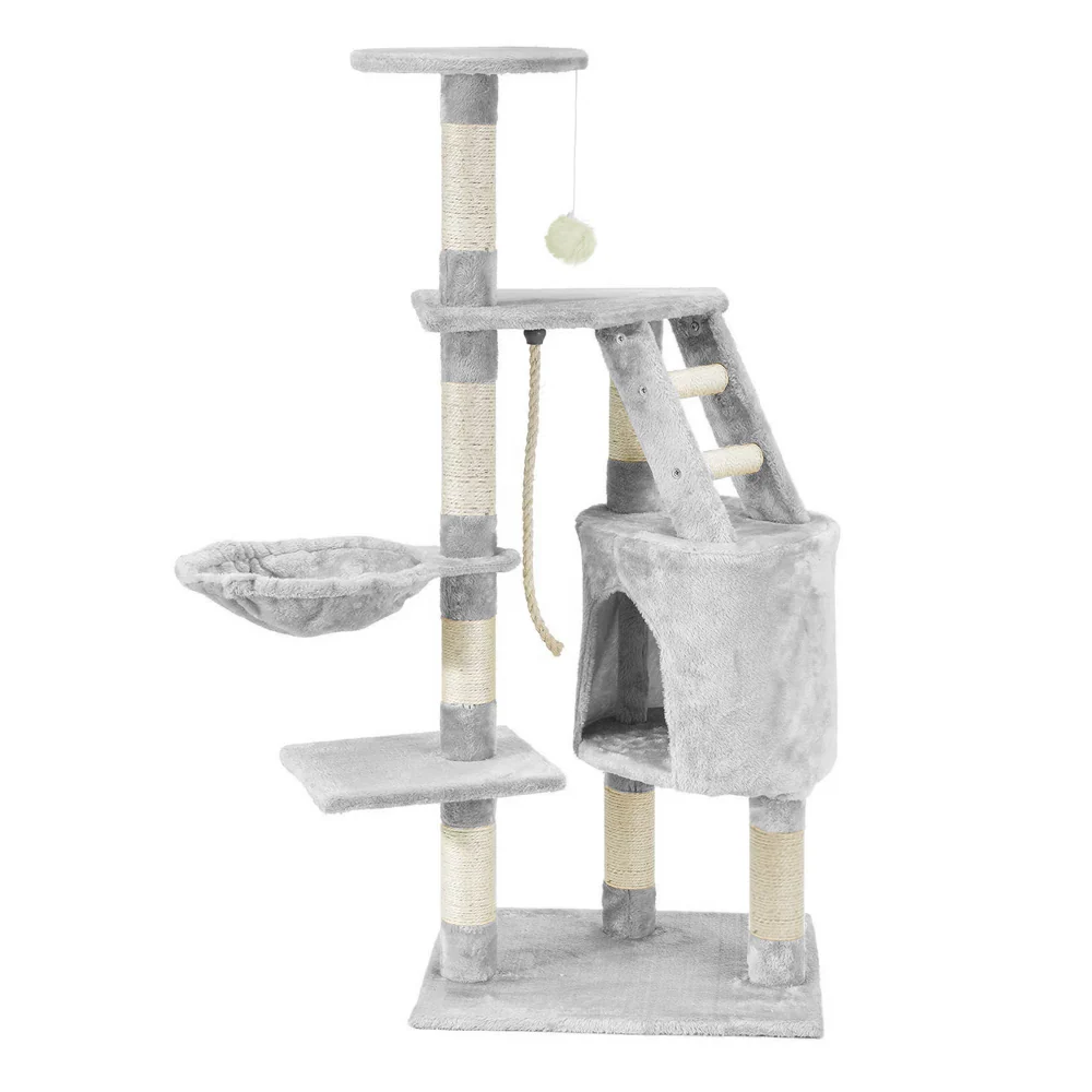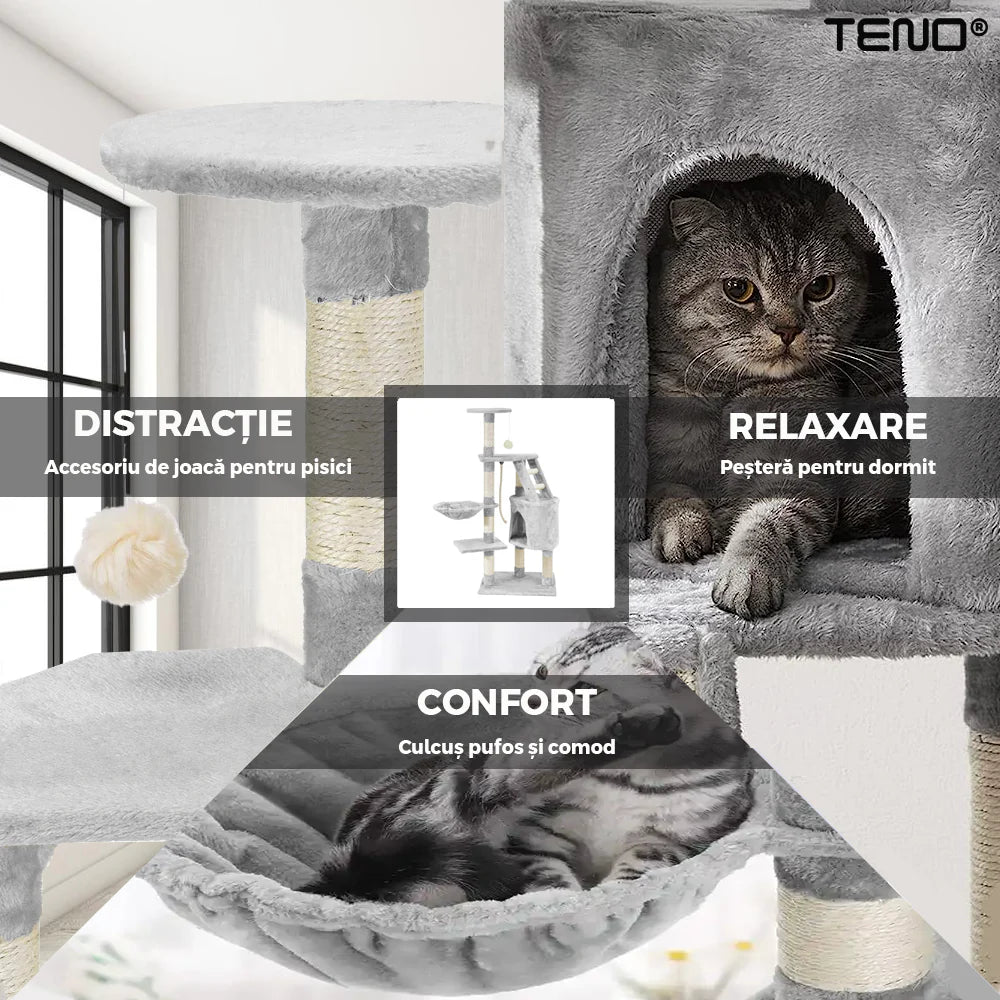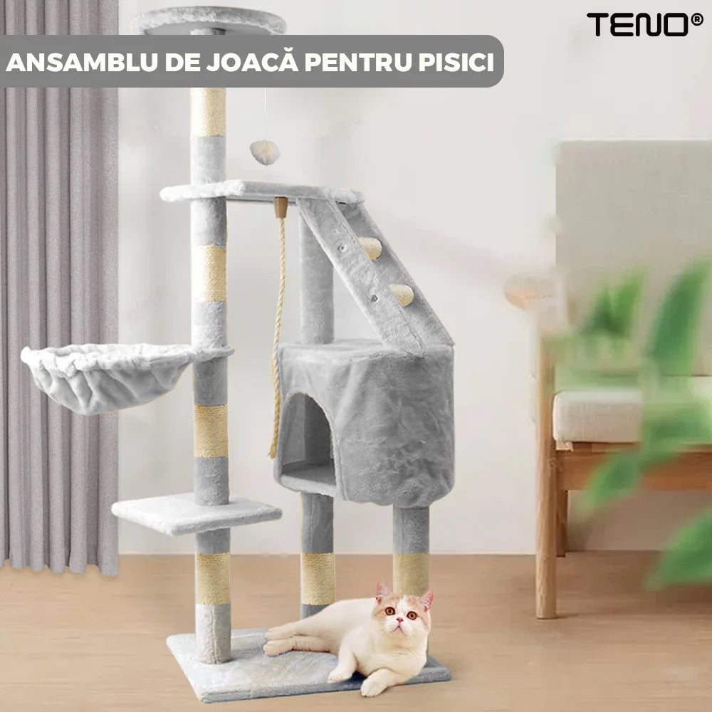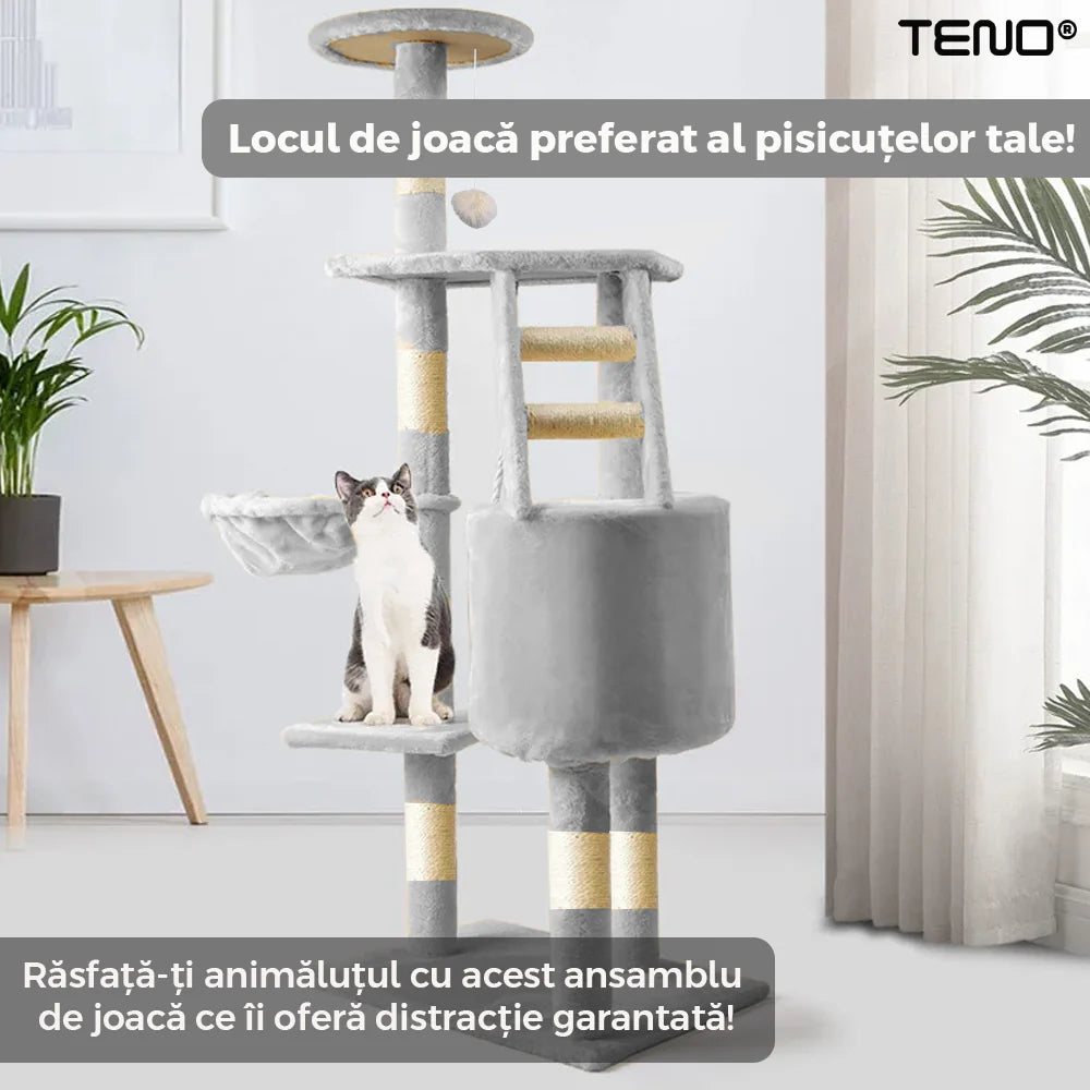 Ansamblu de Joaca pentru Pisici, tip turn, 1 platforma de observatie, 4 niveluri, 1 casuta, scara, franghie si mingiute de joaca, stalpi pentru zgariat, captuseala extra moale, structura stabila, 118 cm, Gri Deschis, Teno820