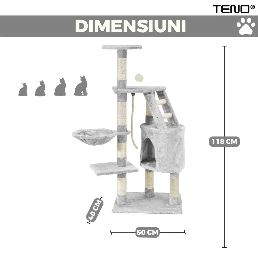 Oferă pisicii tale propriul spațiu de joacă, relaxare și explorare cu acest ansamblu tip turn de 118 cm, conceput pentru activitate zilnică și confort maxim.