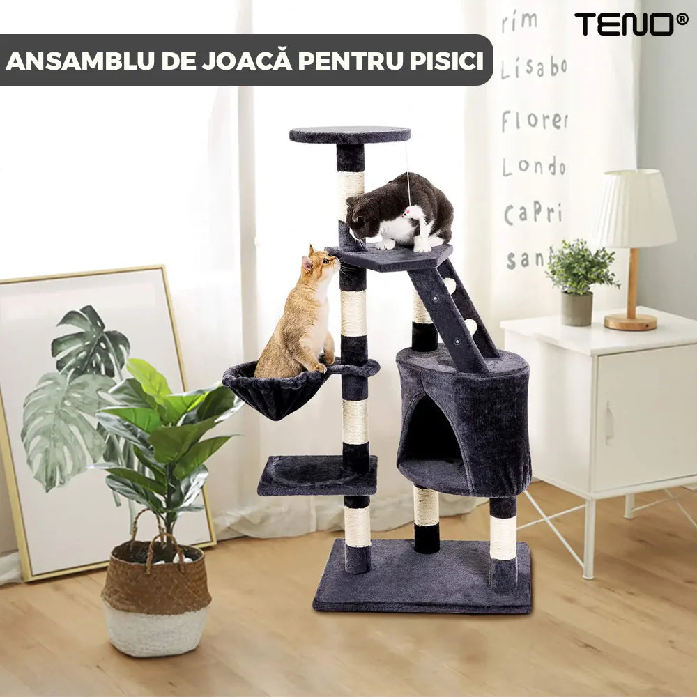 Ansamblu de Joaca pentru Pisici, tip turn, 1 platforma de observatie, 4 niveluri, 1 casuta, scara, franghie si mingiute de joaca, stalpi pentru zgariat, captuseala extra moale, structura stabila, 118 cm, Gri Inchis, Teno631