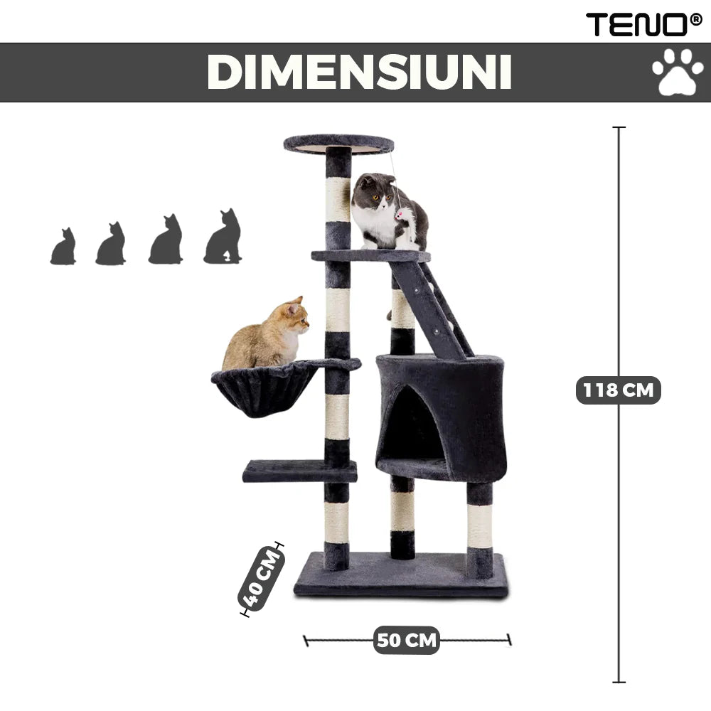 Oferă pisicii tale propriul spațiu de joacă, relaxare și explorare cu acest ansamblu tip turn de 118 cm, conceput pentru activitate zilnică și confort maxim.