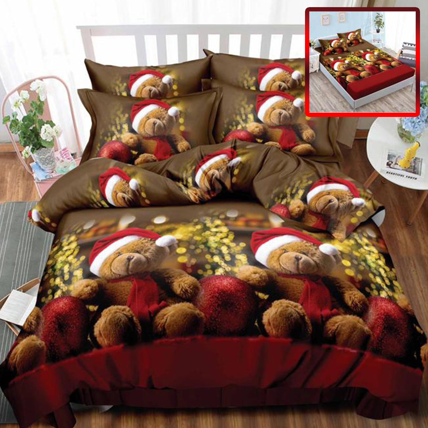Lenjerie de Pat, 2 Persoane, 6 Piese, Bumbac Finet, Craciun, Ursi 2, Rosu/Maro, ST16124-ELASTIC