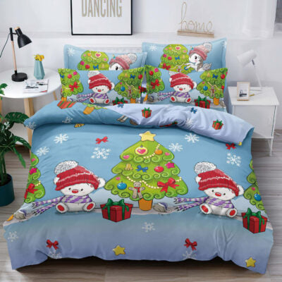 Lenjerie pat, 6 Piese, Bumbac Finet, Craciun, Bradut Verde, Bleu, ST6270