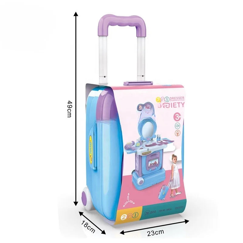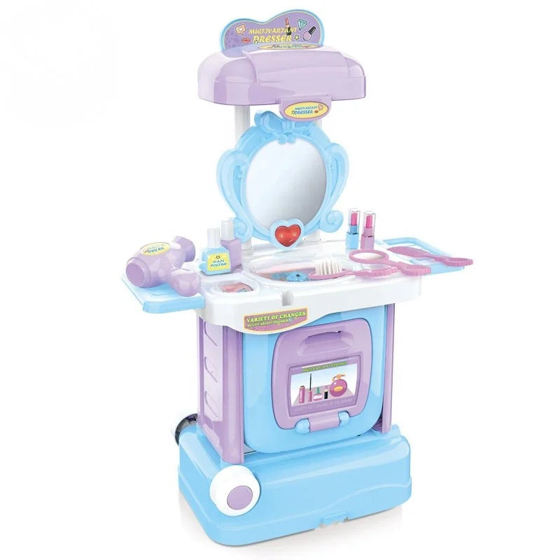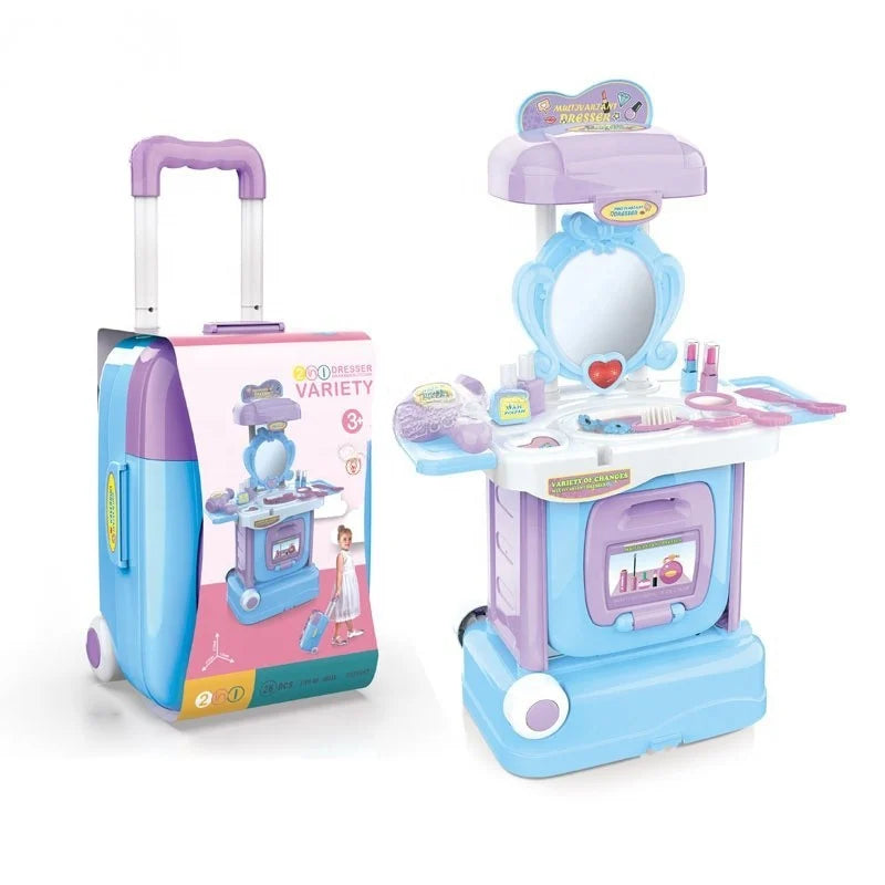 Trol portabil care se transformă rapid într-o comodă de joacă tip „salon”. Perfectă pentru joaca de rol, organizare și distracție oriunde.