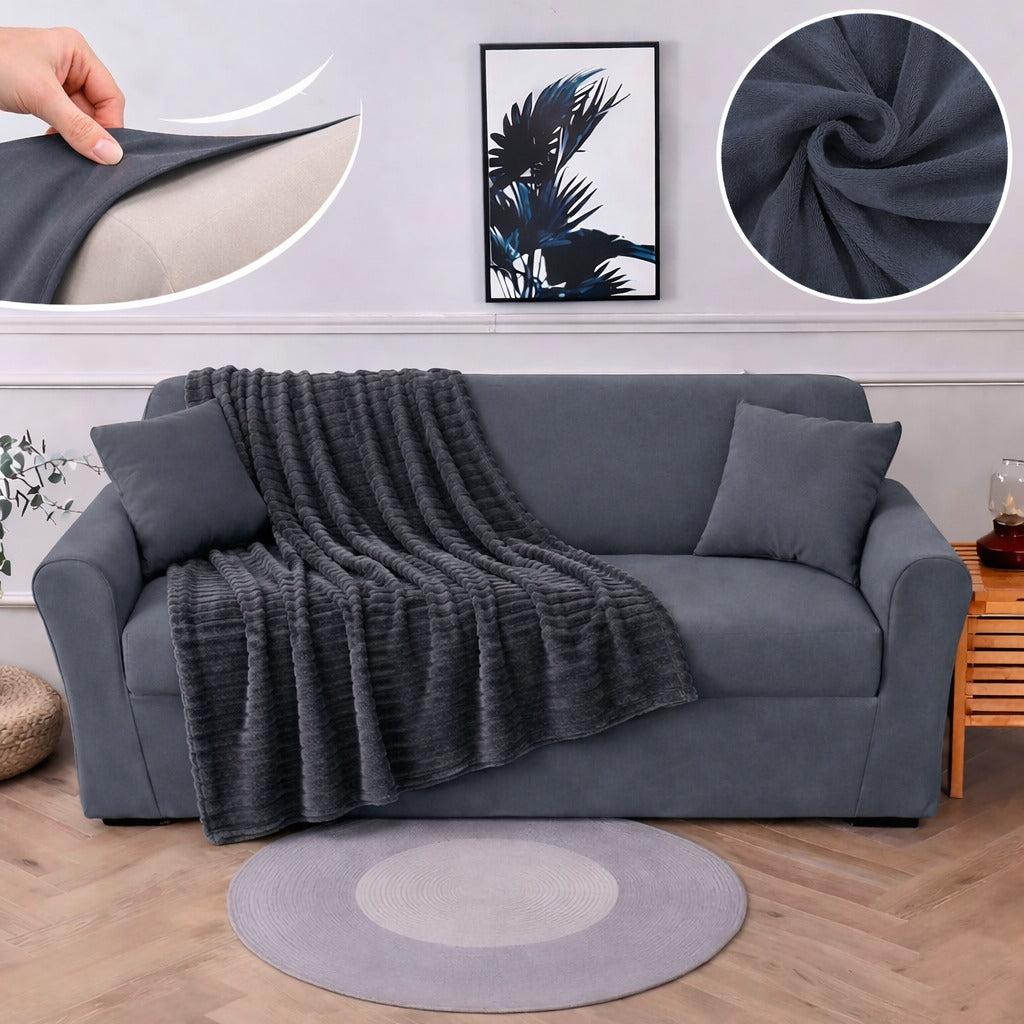 Husa din catifea elastică oferă un aspect rafinat și se mulează perfect pe canapea, iar pătura din cocolino moale completează decorul și adaugă un strat suplimentar de căldură.