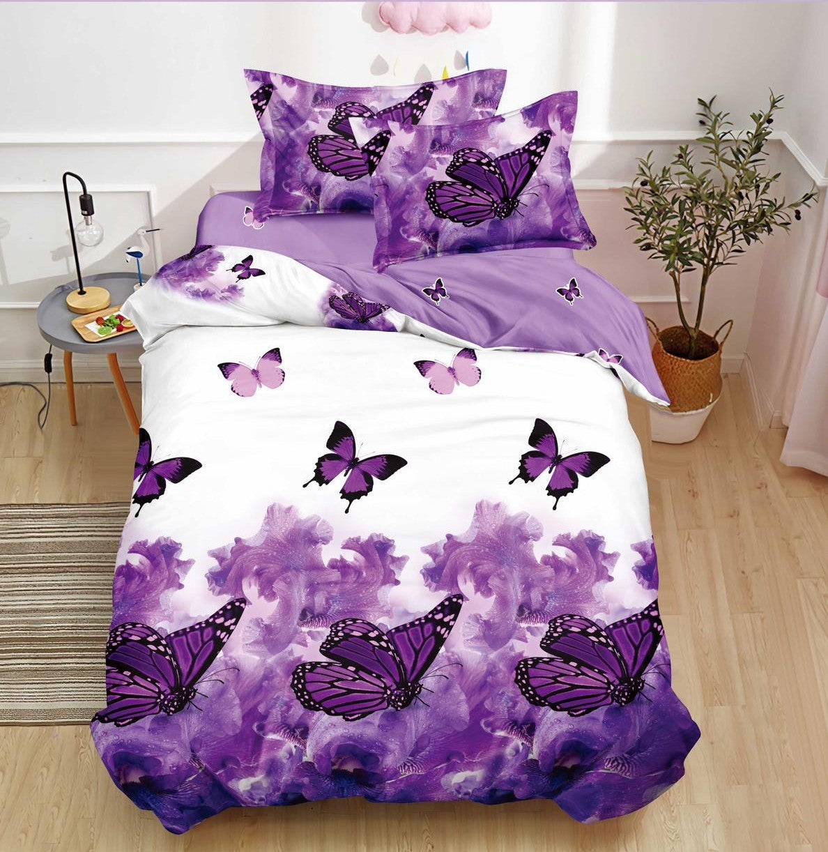 Lenjerie pat single 1 Persoana, 4 PIESE, Bumbac Finet, Fluturi, Alb/Mov, Y60-130