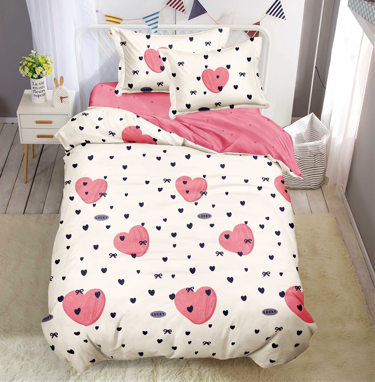 Lenjerie pat single 1 Persoana, 4 PIESE, Bumbac Finet, Inimioare, Alb/Roz, Y60-129