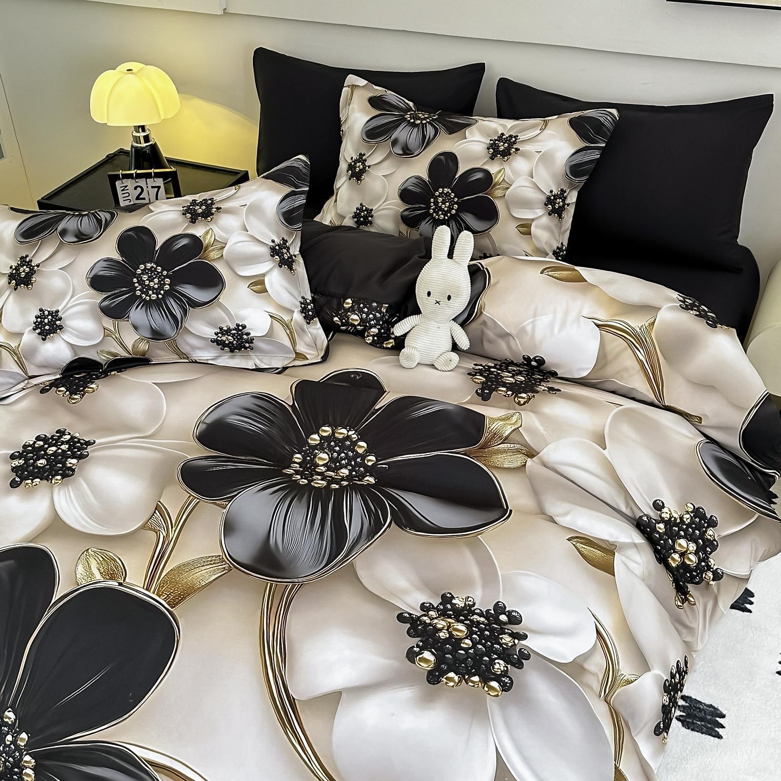 Lenjerie 1 Persoana, 4 PIESE, 5D, Bumbac Finet, Floricele, Alb/Negru, J1423-Elastic