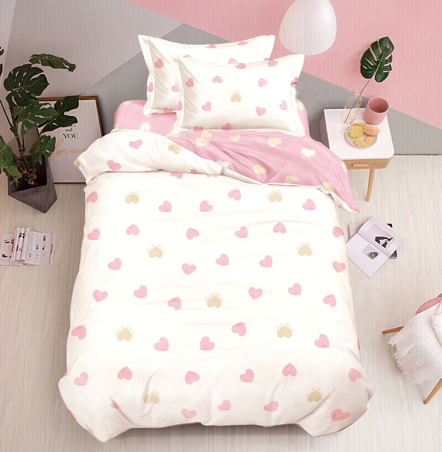 Lenjerie de pat cu elastic, UNI, Pat 1 Persoana, 4 Piese, Inimioare, Alb/Roz, T60-150