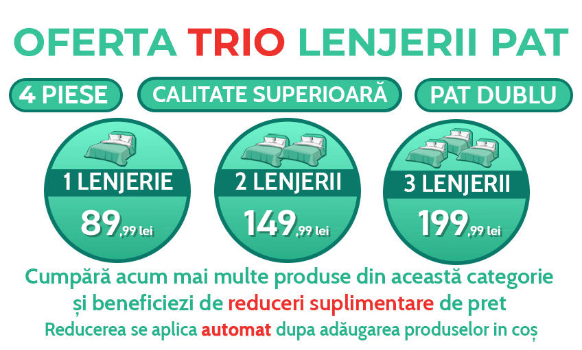 Fiecare detaliu contează, iar TrendyHome înțelege nevoile tale. De aceea, am creat această ofertă specială de TRIO lenjerii de pat, pentru a-ți aduce mai aproape calitatea și luxul la prețuri accesibile.