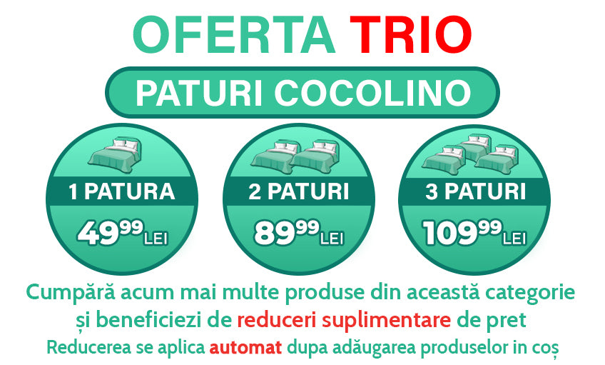 Acum este momentul ideal să îți transformi casa într-un spațiu de relaxare supremă cu paturile noastre Cocolino, deoarece avem o ofertă specială - achiziționează 3 paturi Cocolino la pretul special de 99,99 Lei! Nu rata oportunitatea de a te înconjura cu caldura și rafinamentul acestor paturi minunate.