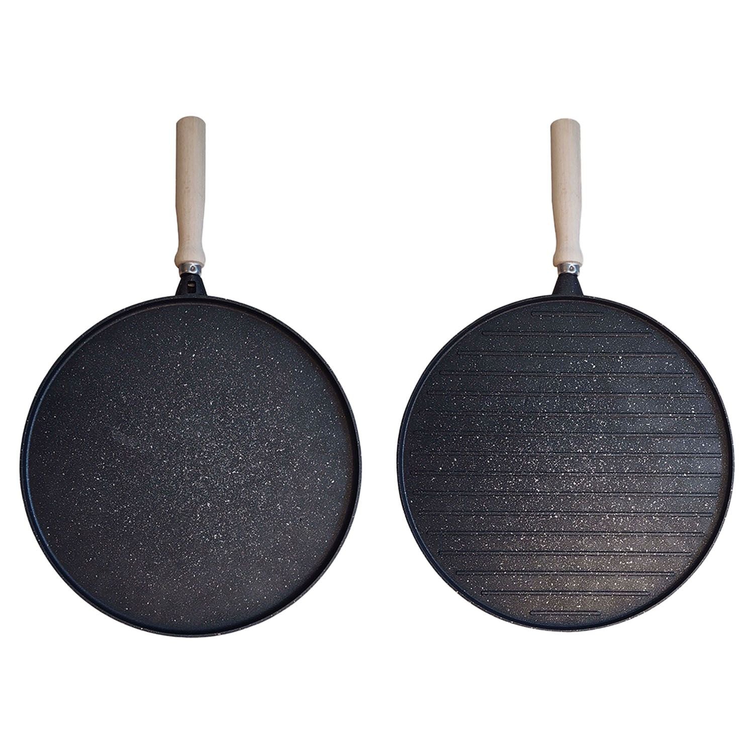 - 2 părți într-o singură tigaie: una netedă pentru clătite și alta grill pentru carne și legume.