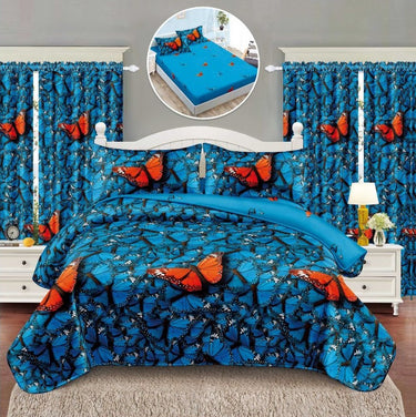Lenjerie Pat 1 Persoană Finet 6 Piese cu Draperii – Model „Blue Monarch” (Fără Elastic)