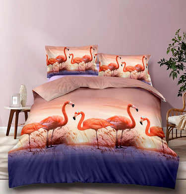 Lenjerie Pat Dublu Satinat 3D – Flamingo Roz la Apus, 4 Piese