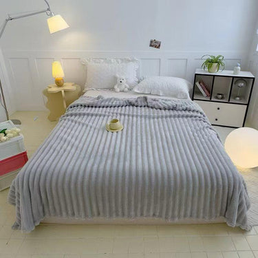 Pătură pufoasă din blăniță artificială tip iepure, în nuanța de Gri Deschis, cu textură in dungi pe toată suprafața. Interiorul moale îți oferă senzația de îmbrățișare caldă, perfectă pentru serile răcoroase, pentru dormit sau pentru relaxare pe canapea. Dimensiunea generoasă de 200×230 cm acoperă confortabil un pat dublu sau un colț de living cozy.