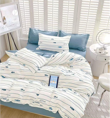Lenjerie de pat modernă din bumbac finet premium, cu design vesel în stil marin: fundal alb, dungi subțiri albastre și imprimeu cu peștișori. Materialul este moale, respirabil și foarte confortabil, ideal pentru orice sezon.