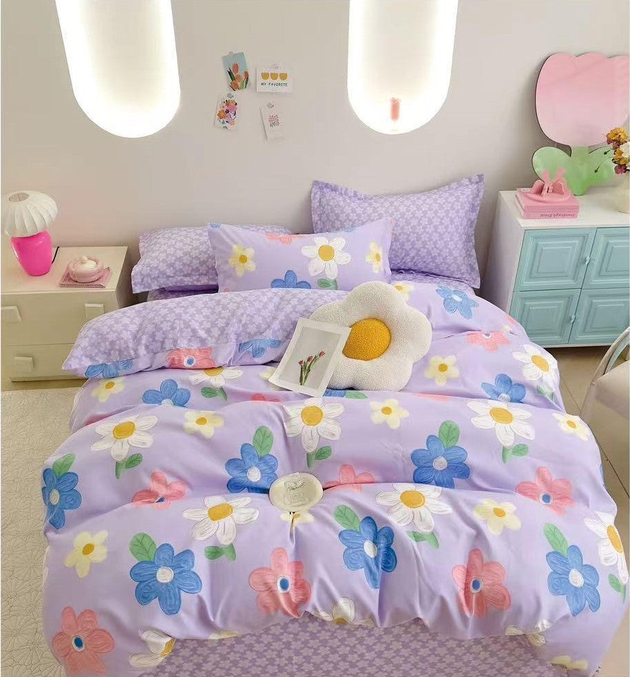Această lenjerie de pat din bumbac finet premium îmbină delicatețea nuanței lila cu un imprimeu vesel format din flori mari multicolore. Este alegerea perfectă pentru un dormitor luminos, feminin sau pentru camera copiilor. Materialul este moale, respirabil și foarte plăcut la atingere.