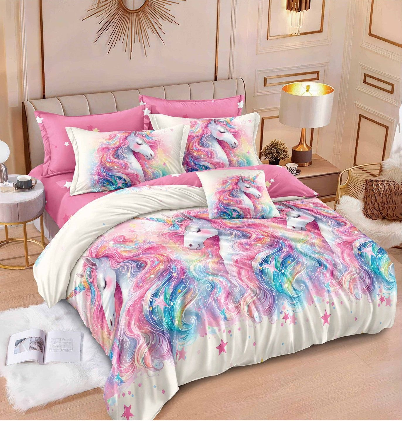 Transformă dormitorul într-un univers magic cu această lenjerie din bumbac finet, cu imprimeu spectaculos de unicorni în culori pastelate și fundal roz delicat. Materialul este moale, respirabil și perfect pentru pielea sensibilă a copiilor (și nu numai!).