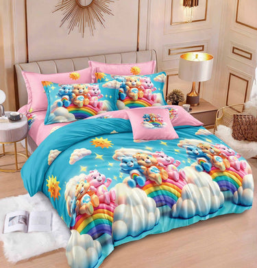 Set de lenjerie vesel și colorat, ideal pentru copii, cu imprimeu 3D superb cu ursuleți pe curcubeu, nori pufoși și elemente vesele de soare și stele. Materialul este bumbac finet premium, moale, respirabil și rezistent în timp.