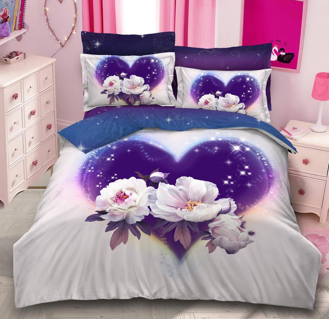 Un model spectaculos, intens și elegant, perfect pentru dormitoare moderne. Lenjeria prezintă un inimă violet strălucitoare înconjurată de lumină și flori albe de bujor, cu detalii luminoase și efect cosmic discret. Finetul gros păstrează culorile vibrante, iar cearceaful de pat degrade violet–albastru completează designul de lux.