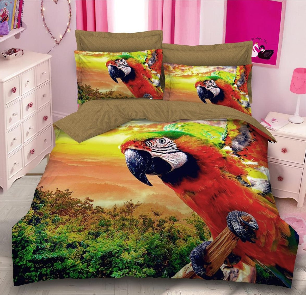 O lenjerie spectaculoasă din bumbac finet premium, cu imprimeu fotorealist al unui papagal Ara multicolor, redat în nuanțe intense de roșu, verde, galben și albastru. Fundalul în degrade cald – galben, portocaliu și roz – creează un efect vizual de apus tropical, perfect pentru a transforma complet atmosfera dormitorului. Cearceaful de pat este uni, într-o nuanță de cafeniu–olive, care echilibrează vizual intensitatea imprimeului.