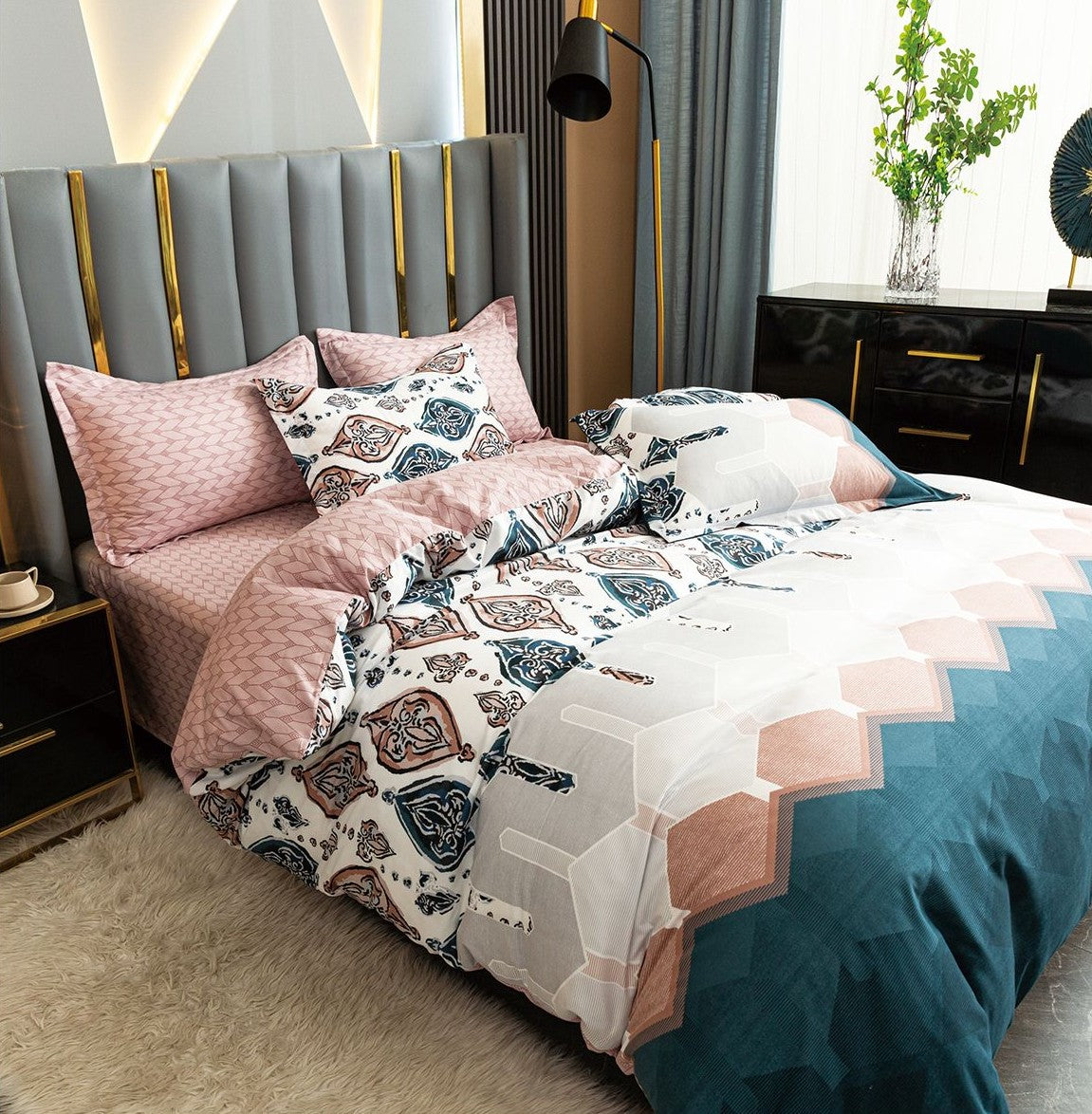 - Design modern în nuanțe de roz pudra/turcoaz, ideal pentru dormitoare elegante.