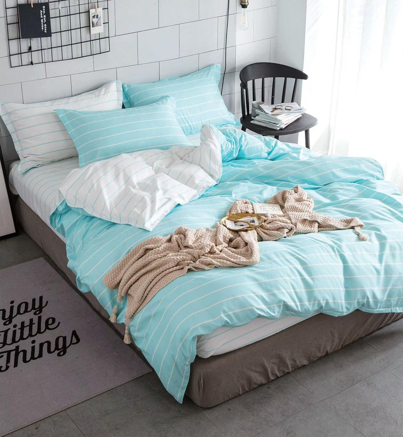 Lenjerie din bumbac satinat 100%, realizată într-o combinație rafinată de bleu, decorată cu un imprimeu in dungi. Materialul este moale, plăcut la atingere, perfect pentru un somn liniștit și un aspect elegant în orice dormitor.