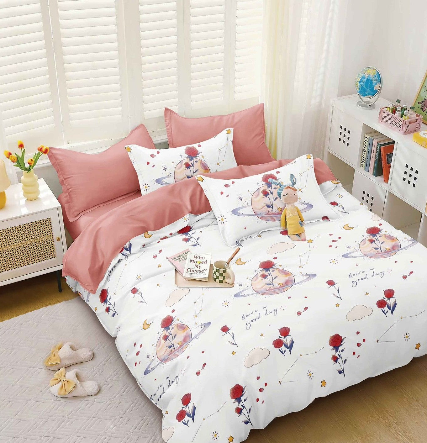 | Culoare & design | Alb/Roz, Planete/Flori |