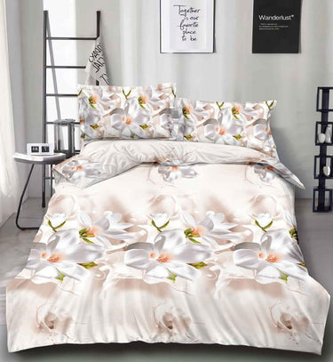 Lenjerie de Pat Dublu cu Elastic, 4 Piese, 3D – Model Floral, Bej/Alb, BT-08
