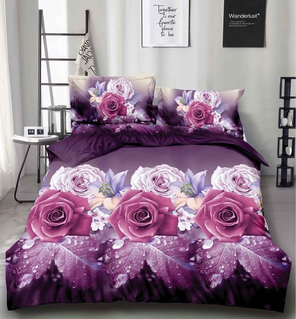 Lenjerie de Pat Dublu cu Elastic, 4 Piese, 3D – Trandafiri, Roz/Mov, BT-09