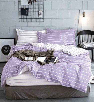 Lenjerie de Pat Dublu 4 Piese – Bumbac Satinat, cu Elastic, Dungi, Mov/Alb