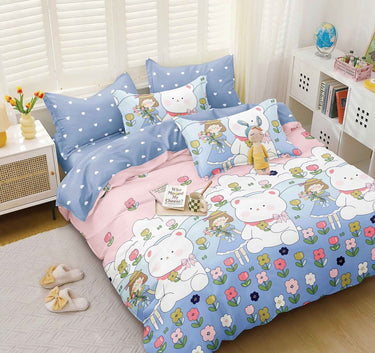 Lenjerie de Pat Dublu cu Elastic, Bumbac Satinat, 4 Piese, Fetita/Ursuleti, Albastru/Roz E 114