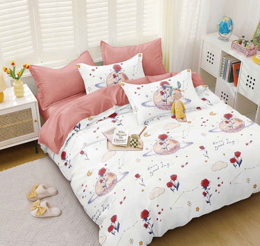 Lenjerie de Pat Dublu 4 Piese – Bumbac Satinat, cu Elastic , Flori/Planete, Roz/Alb