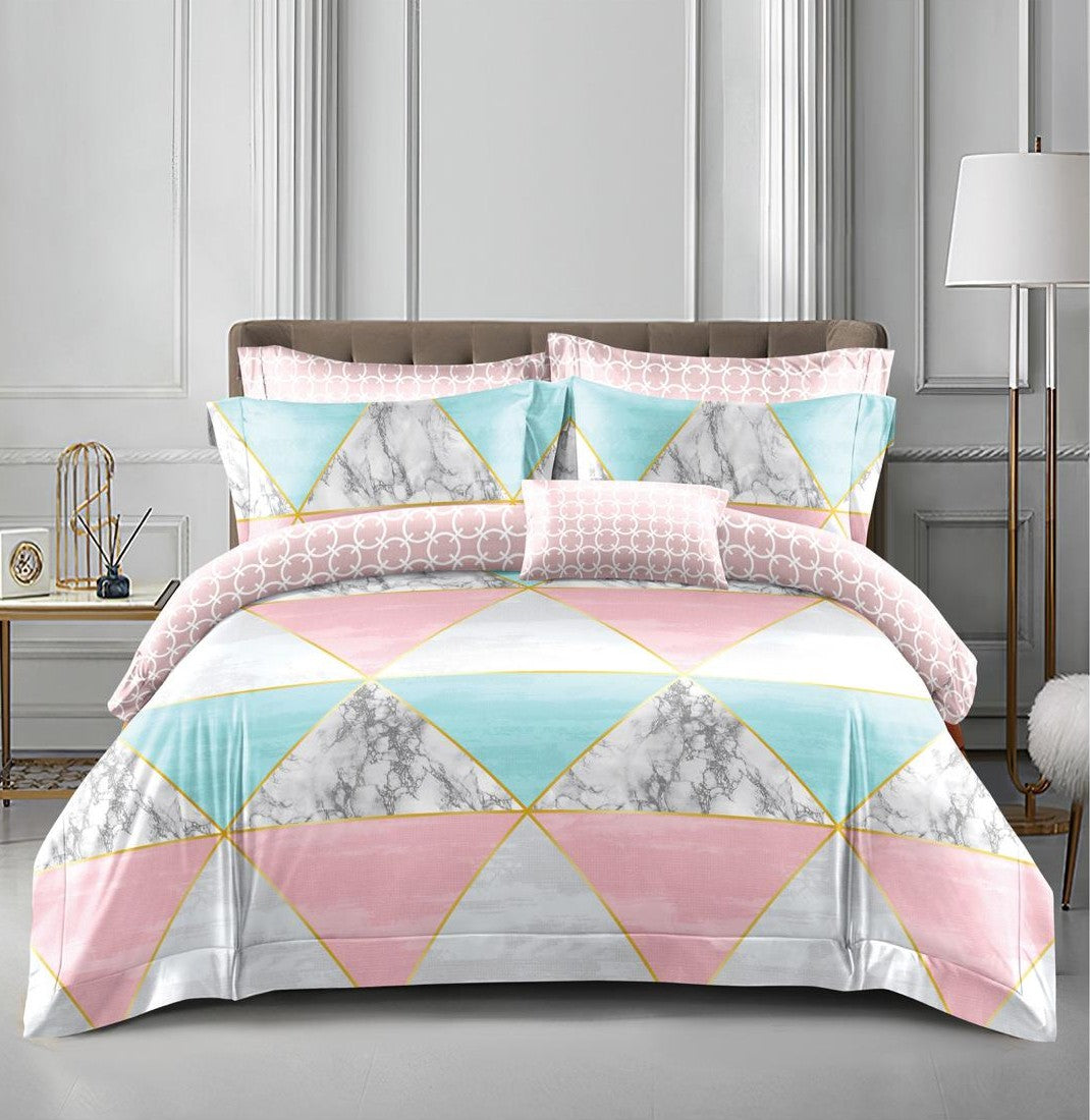 Lenjerie de Pat Dublu 4 Piese – Bumbac Satinat, cu Elastic, Modern Geometric, Roz/Albastru Deschis
