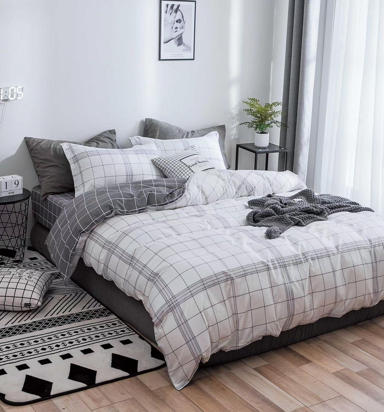 Lenjerie de Pat Dublu cu Elastic, Bumbac Satinat, 4 Piese, Carouri, Gri/Alb E 105
