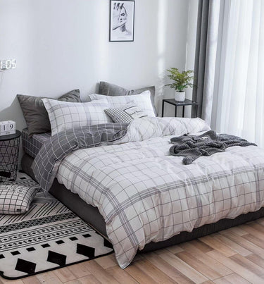 Lenjerie de Pat Dublu 4 Piese – Bumbac Satinat, cu Elastic, Carouri, Gri/Alb