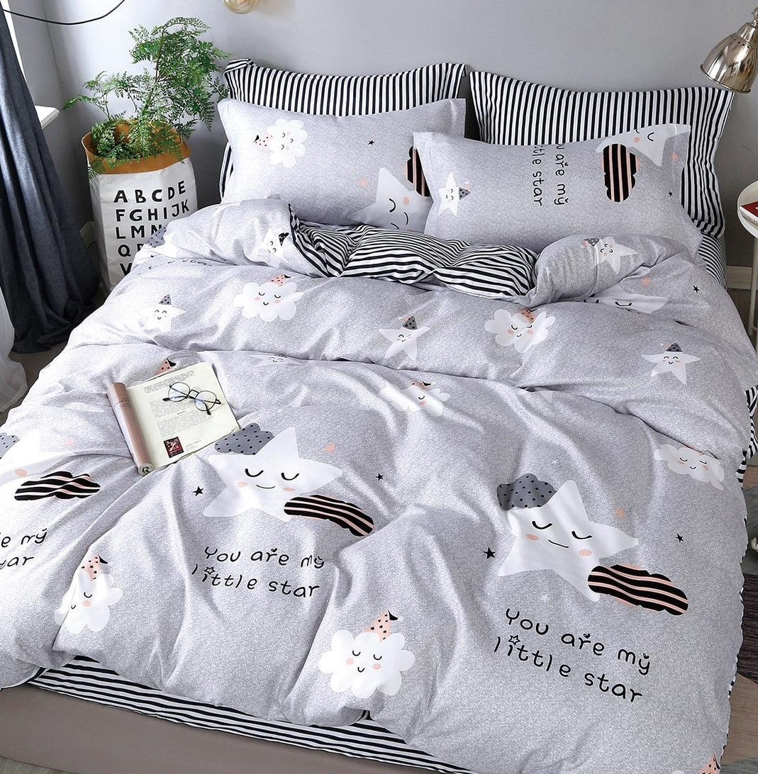 Lenjerie de Pat Dublu cu Elastic, Bumbac Satinat, 4 Piese, Stele/Dungi, Gri/Negru E 5