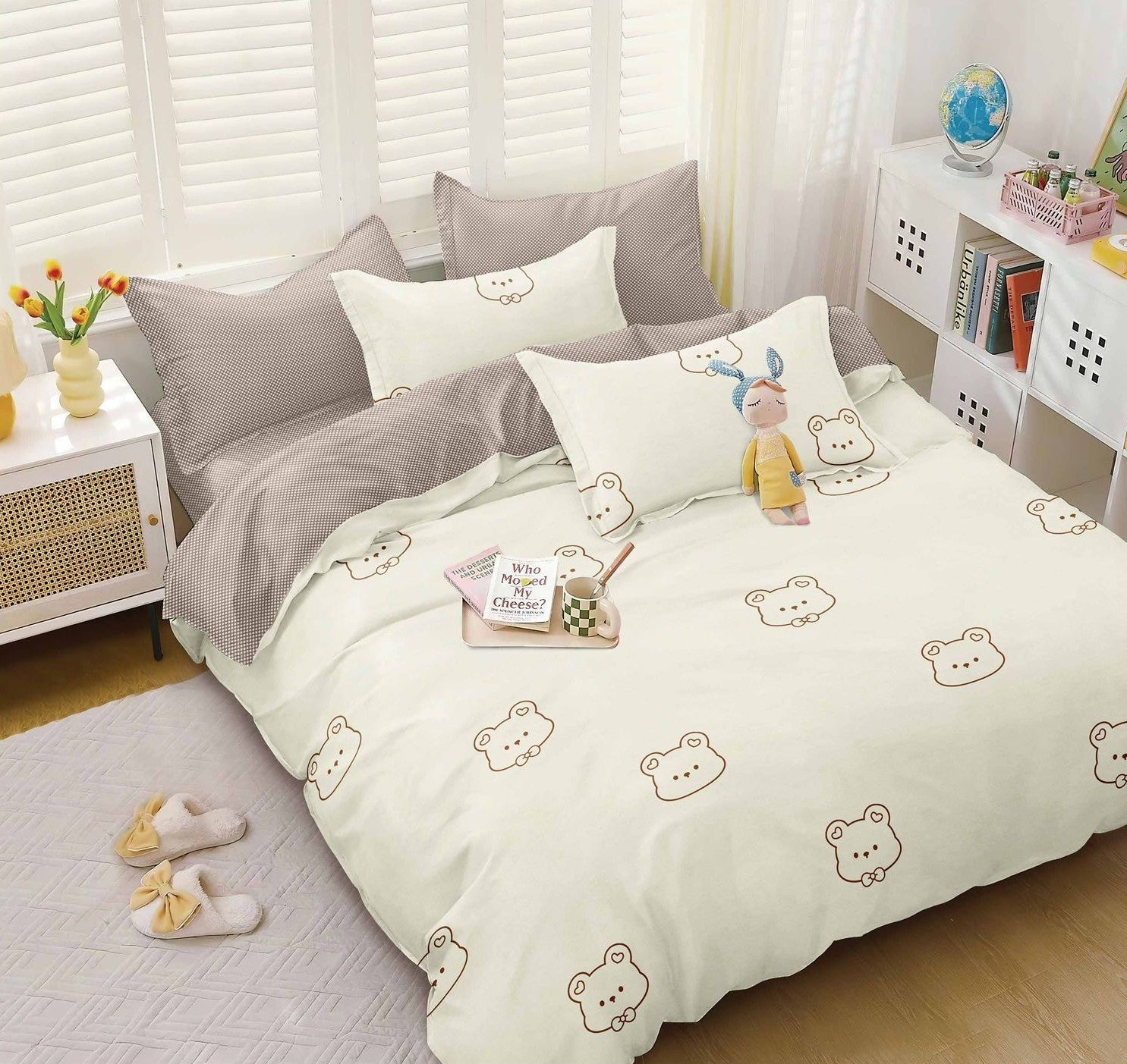 Lenjerie de Pat Dublu cu Elastic, Bumbac Satinat, 4 Piese, Ursuleti, Crem/Bej E 117