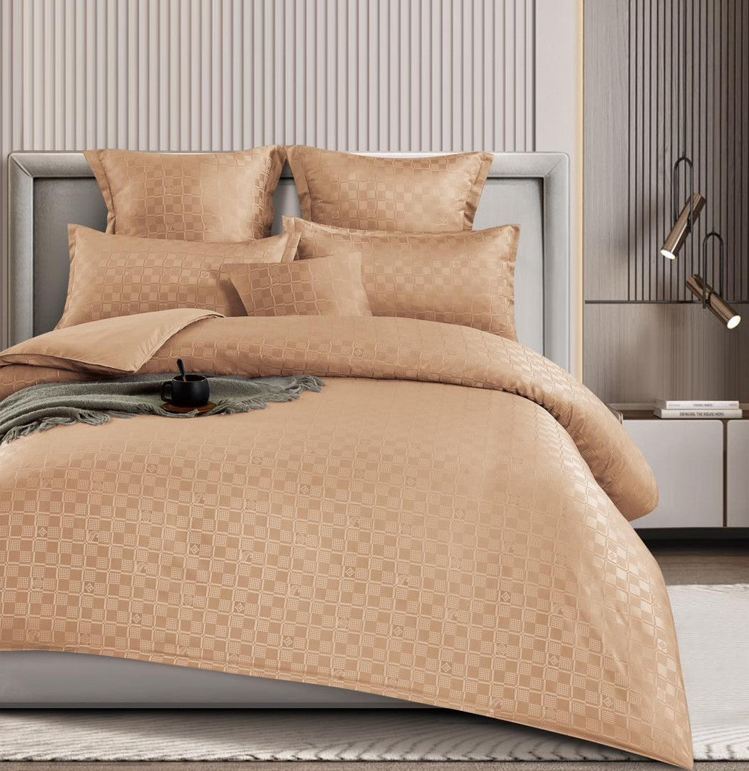 Lenjerie din finet gros într-o nuanță intensă de crem, cu un discret model în carouri satinate care prinde frumos lumina. Setul este ideal pentru dormitoarele moderne sau clasice care își doresc un plus de rafinament, fără imprimeuri încărcate. Cearceaful de pat este prevăzut cu elastic pe colțuri, pentru a îmbrăca perfect salteaua, iar pilota și fețele de pernă sunt realizate în același design unitar, elegant și ușor de asortat.