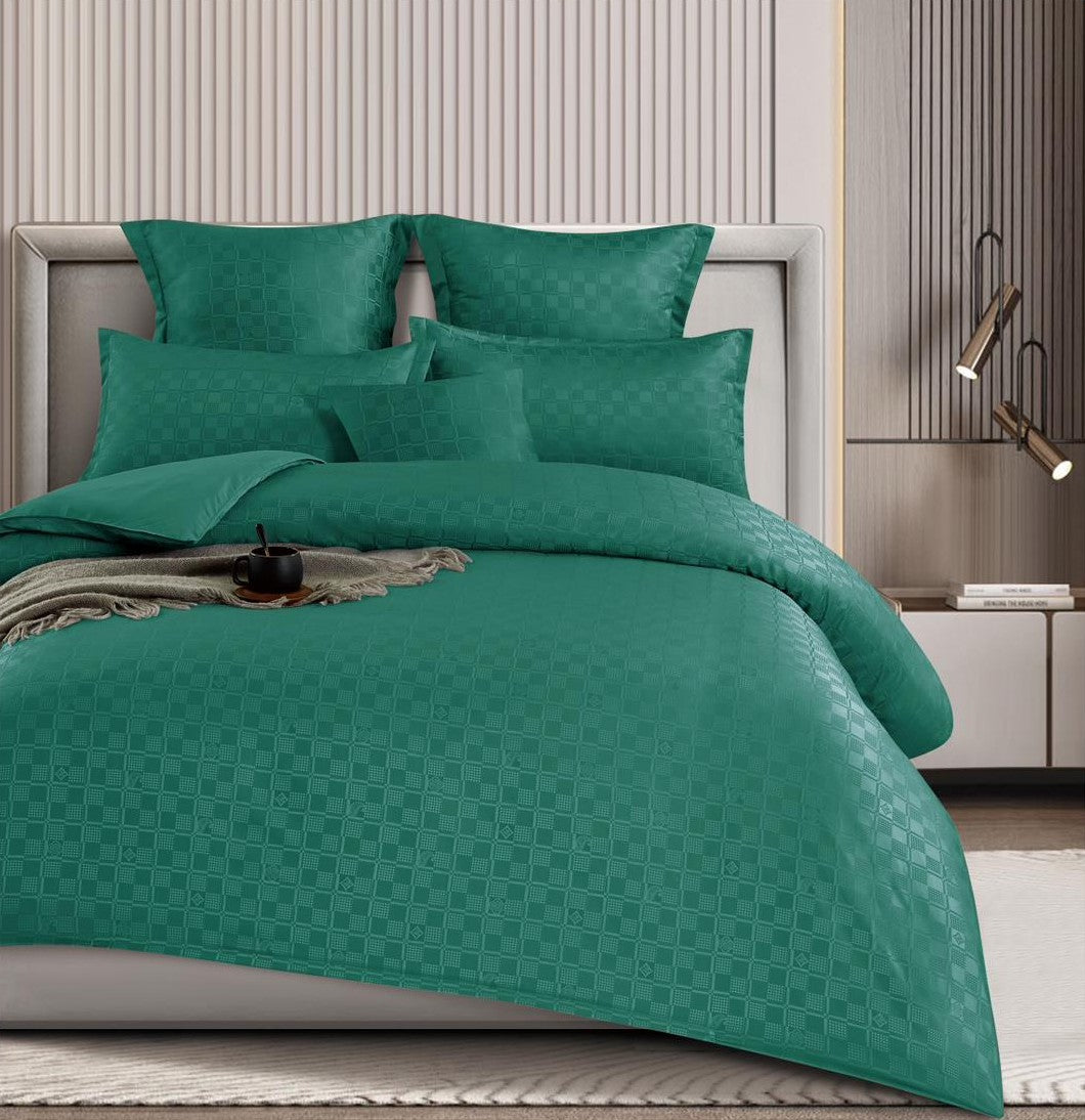 Lenjerie din finet gros într-o nuanță intensă de verde smarald, cu un discret model în carouri satinate care prinde frumos lumina. Setul este ideal pentru dormitoarele moderne sau clasice care își doresc un plus de rafinament, fără imprimeuri încărcate. Cearceaful de pat este prevăzut cu elastic pe colțuri, pentru a îmbrăca perfect salteaua, iar pilota și fețele de pernă sunt realizate în același design unitar, elegant și ușor de asortat.