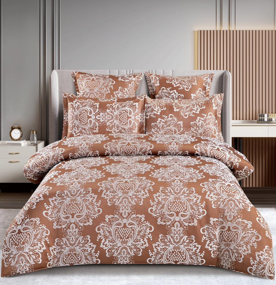 Lenjerie elegantă din finet jacquard cu fundal crem și ornamente baroc albe, dispuse simetric pe toată suprafața pilotei și a fețelor de pernă. Modelul bogat, cu arabescuri și detalii fine, transformă patul într-un punct central sofisticat al dormitorului. Cearceaful de pat este negru, cu elastic pe colțuri, pentru o așezare perfectă pe saltea, fără cute.