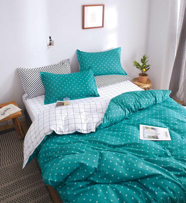 Lenjerie Bumbac Satinat 4 Piese – Turcoaz cu Steluțe & Alb cu Carouri