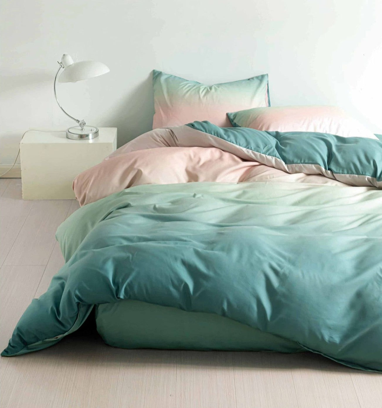 Lenjerie Bumbac Satinat 4 Piese – Degrade Verde Mentă & Roz Pudră