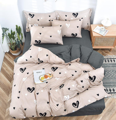 Lenjerie din bumbac satinat fin, într-o nuanță caldă de bej nude, decorată cu un imprimeu jucăuș de inimioare negre pline și inimioare albe conturate. Cearceaful de pat este gri închis, cu model discret, creând un contrast elegant cu pilota și fețele de pernă bej. Setul se potrivește perfect pentru dormitoare moderne, pentru cupluri sau pentru oricine își dorește un aer romantic, dar discret, în decor.