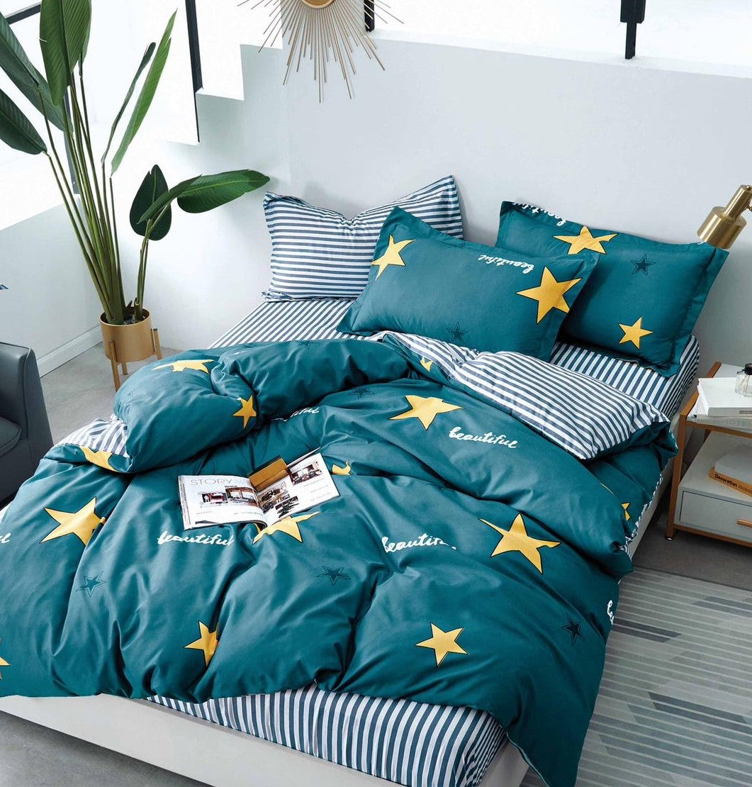Lenjerie din bumbac satinat într-o nuanță intensă de verde petrol, decorată cu stele galbene mari și detalii de stele mici conturate. Cearceaful de pat și fețele de pernă din fundal au dungi alb–bleumarin, oferind un contrast modern și fresh, ideal pentru dormitoare tinerești sau stil urban. Materialul este neted, plăcut pe piele și ușor de întreținut.