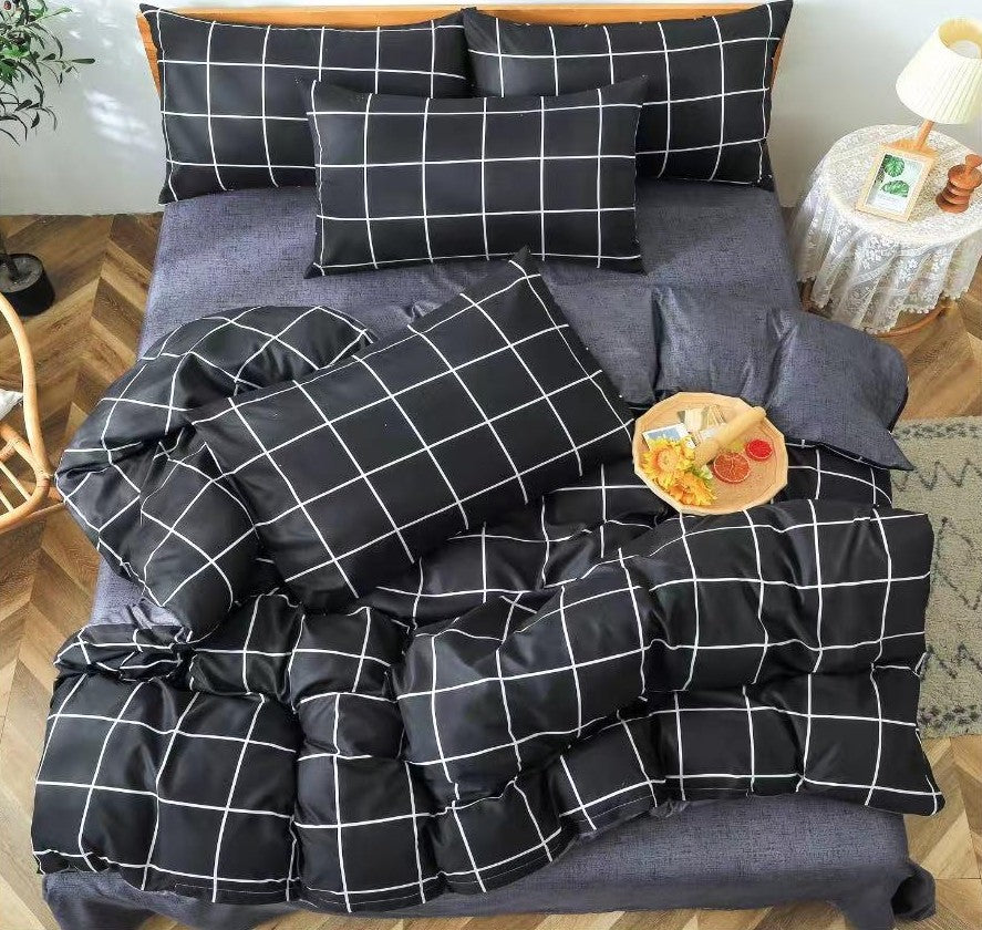 Lenjerie Bumbac Satinat 4 Piese – Negru cu Carouri Albe Minimaliste