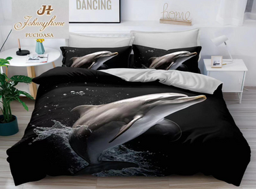 Lenjerie Pat Dublu, Bumbac Satinat, 3D, Delfini, Negru/Gri, B-601