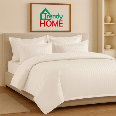 Lenjerie de pat din damasc alb imaculat, cu dungi satinate elegante. Este alegerea ideală pentru un dormitor luminos, curat și sofisticat, potrivit atât pentru acasă, cât și pentru pensiuni sau hoteluri.