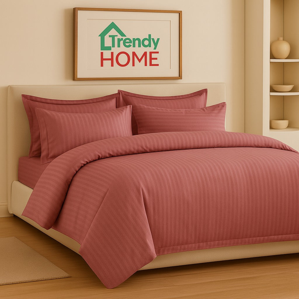 Set de lenjerie de pat din damasc, 6 piese, într-o nuanță caldă de roz somon, cu dungi satinate fine. Textura este plăcută la atingere, rezistentă la spălări frecvente și oferă dormitorului un aer elegant și primitor.