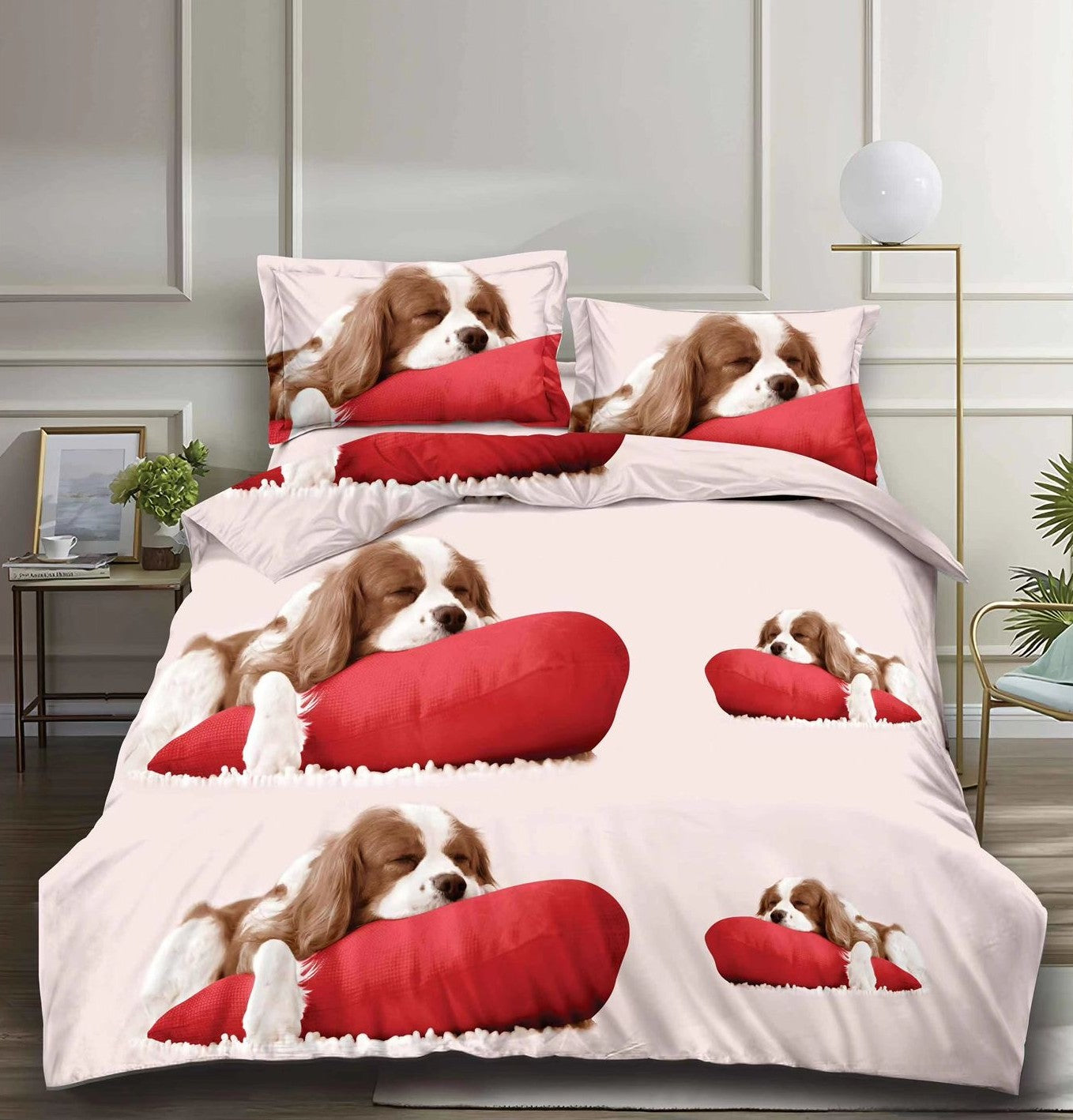 O lenjerie adorabilă și realistă din satinat 3D, cu fundal crem deschis și imprimeu spectaculos cu cățeluș adormit sprijinit pe o pernuță roșie moale. Model ideal pentru iubitorii de animale sau pentru un dormitor cald și primitor.